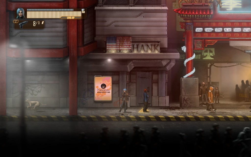 The 2D artwork is excellent. Each game location has a distinct look, from the industrial scrapyard to the Chinese quarter. Unfortunately, side quests and the main plot do not take you to all the locations enough. This problem is accentuated by the fast-travel which allows players to go to any location from any other. One can take the scenic route. Especially after clearing out any enemies (which do not respawn), it is easy to run through locations to get to destinations. I think I would prefer a more limited fast-travel system. A hub sort of system with four or five fast-travel locations that then asked players to slow-travel one or two screens to the final destinations would force players to ogle the gorgeous backgrounds more often.