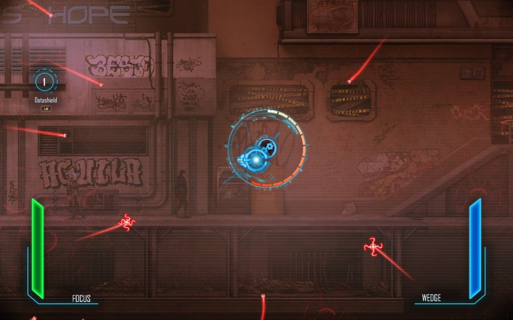 Like any good open-world cyberpunk game, Dex can hack computers, cameras, and gun turrets. Hacking opens a small twin-stick shooter minigame. Enemies attack Dex’s avatar while she must stay in place over a certain point for the hack to complete. Dex is able to switch into hack-mode without any special gear (this is explained in the story) at any time, even while in mid-punch or jumping. This is great because Dex can hack vending machines for extra cash and she can hack enemies to stun them.